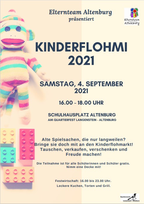 Am Samstag, den 4. September 2021, findet auf dem Schulhausplatz Altenburg ein Kinderflohmi statt. Weitere Informationen zum "Wie" und "Wann" sind dem Flyer zu entnehmen.