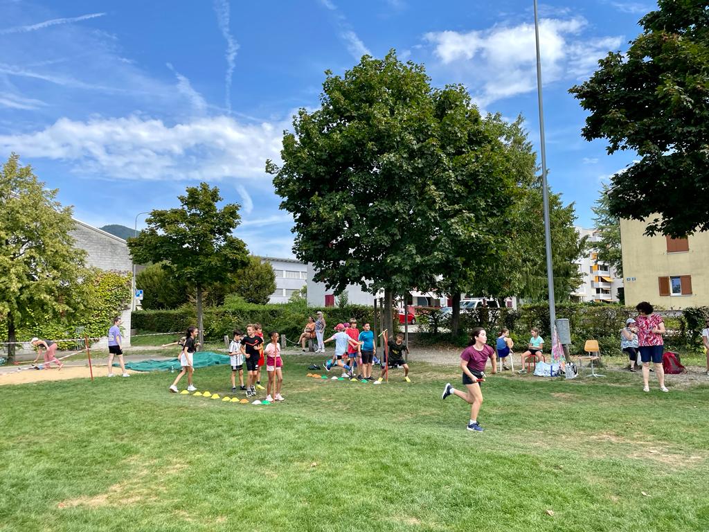 Auf der Sportwiese des Schulhauses Altenburg glitzert der Morgentau, die Sonne steht noch tief, aber bereits wuseln rund 45 Lehrpersonen mit ihren Assistentinnen und Assistenten auf dem weitläufigen Gelände herum: Für den heutigen Sporttag müssen Strecken ausgemessen, Leitplanken aufgestellt, Abschrankungen befestigt, Spielgeräte aufgestellt, Pflaster, Coldpacks und Znünis organisiert werden ... alles klappt wie am Schnürchen und pünktlich um 8.20 Uhr starten die 362 Kinder der 1. bis 4. Primar mit ihren sportlichen und spielerischen Wettkämpfen.