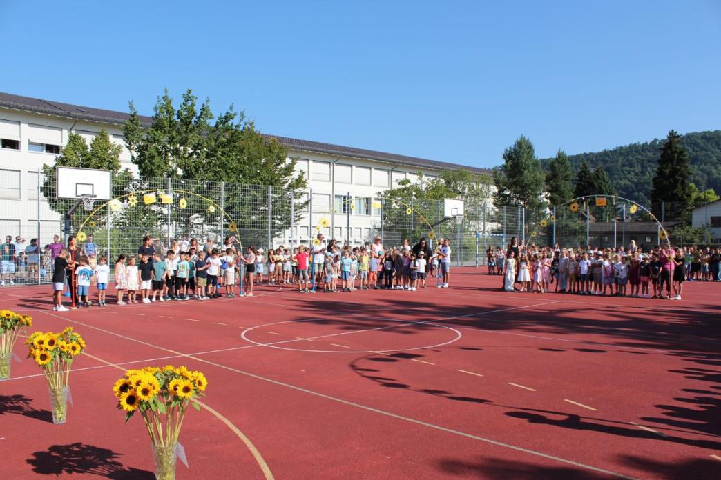 Erwartungsvoll, mutig, vielleicht aber auch etwas vorsichtig schritten die neuen Kinder zuvor unter den Sonnenblumenbögen hindurch auf den Pausenplatz, wo sie klatschend von der Schülerschaft, den Lehrpersonen und allen anderen Anwesenden empfangen wurden.