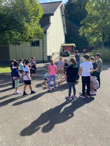 Pünktlich treffen sich alle Klassen im Schulhaus, um gemeinsam den Weg in die Aue anzutreten. Die Stimmung ist gut und die Vorfreude auf den Anlass spürbar.