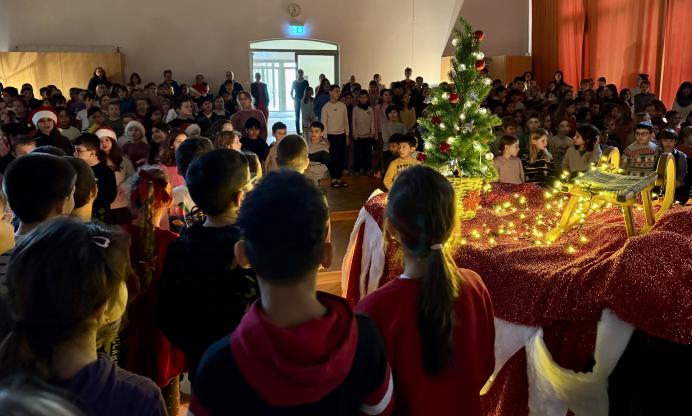 Leise, besinnliche Klänge schlagen die 4. Klassen mit «Somewhere in my Memory» an. Und die Klassen aus dem Container bringen die Aula mit ihrem Kanon «En helle Stern» und den Melodica-Klängen zum Leuchten.